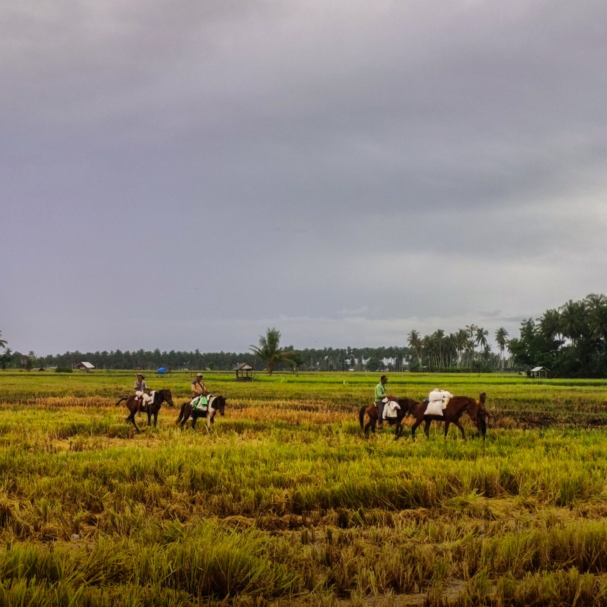 petani yang sedang memanen hasil sawahnya menggunakan kuda (Ma'teke Pare)